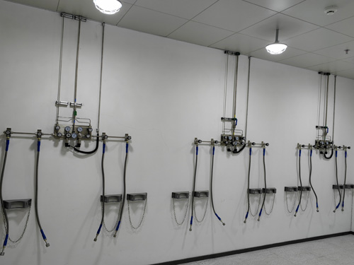 8.氣瓶間內的氣休液化氣氧氣瓶與重壓值控制器間所采用SS316L低壓變壓器金屬件膠管拼接無固化。低壓變壓器膠管為主動膠管,以切實保障拼接的便利性。并自導防防鋼纜,防治極致具體情況下,液化氣氧氣瓶閥受損等表現介紹的低壓變壓器“抽鞭”事件。重壓值控制器與排水管道的拼接習慣為雙環卡套。